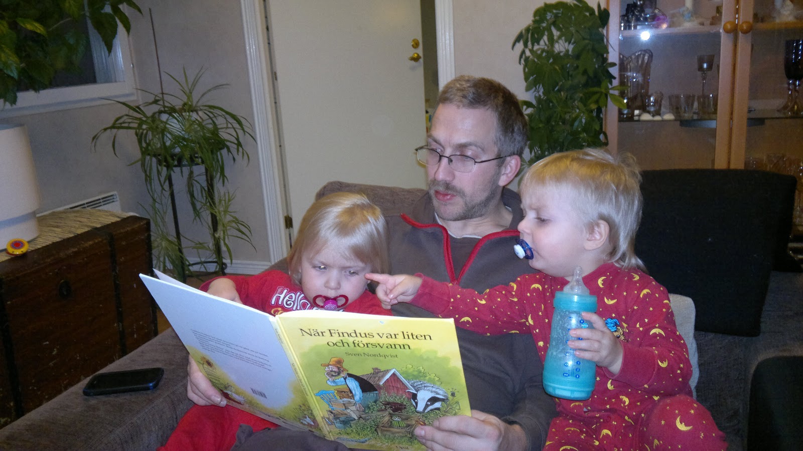 Sanna ville att jag skulle läsa saga ikväll så det gjorde jag, men William envisades att även pappa skulle läsa en bok på "pappas språk" så det blev så med.